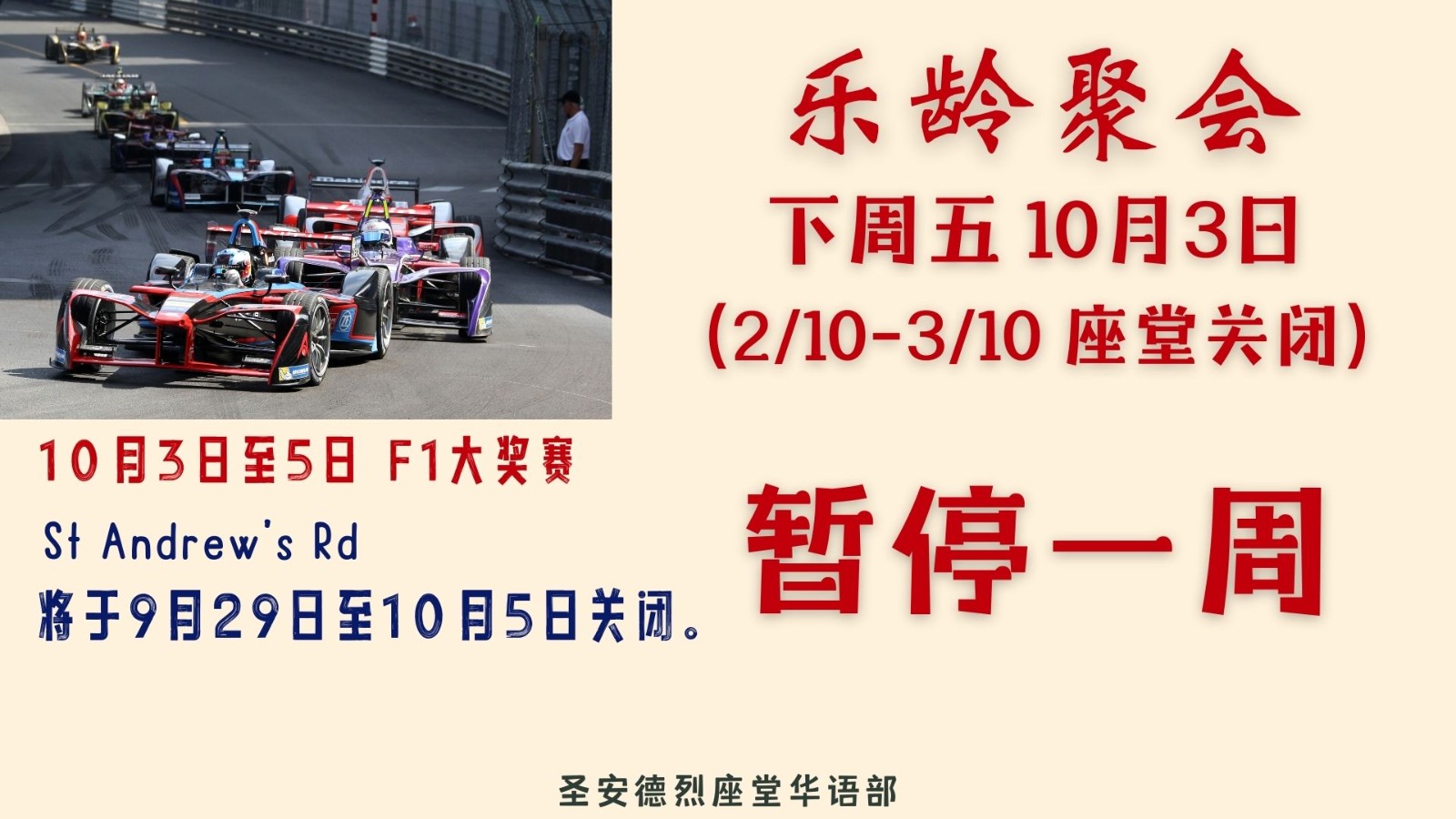 由于F1大赛,乐龄聚会10月3日暂停一周。