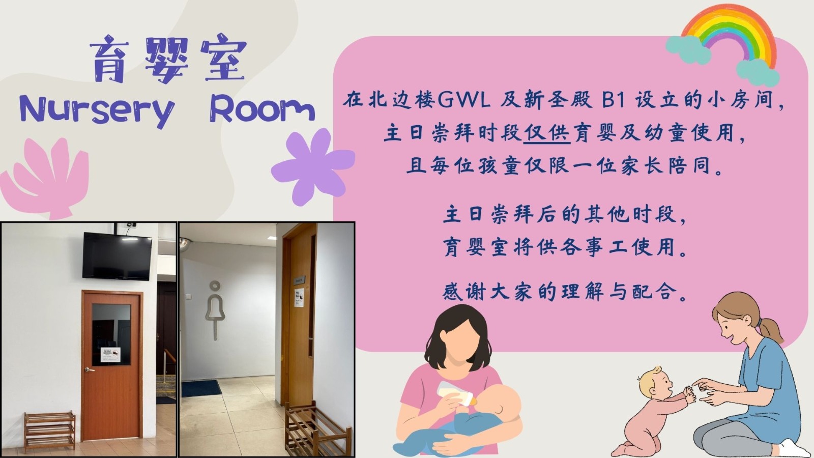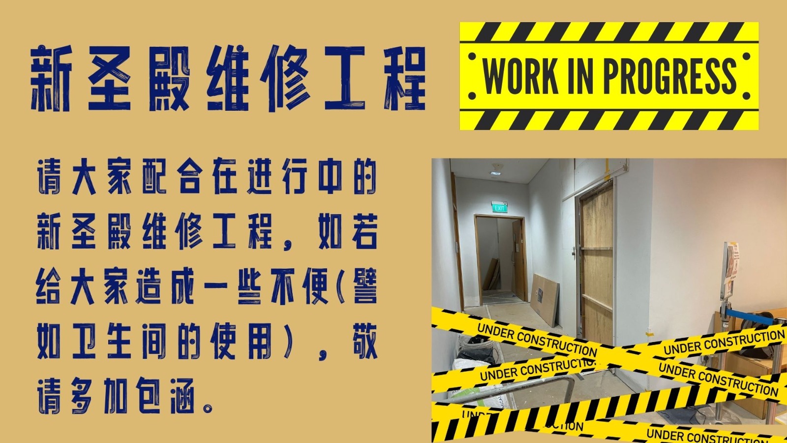 请大家配合在进行中的新圣殿维修工程。照成的不便,敬请包涵。