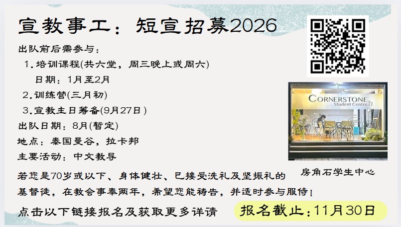 若有紧急牧养需要,请联系黄甘霖牧师(90233410)