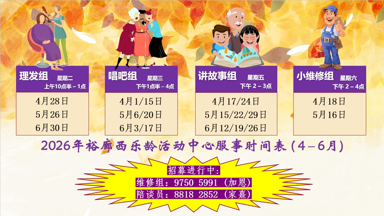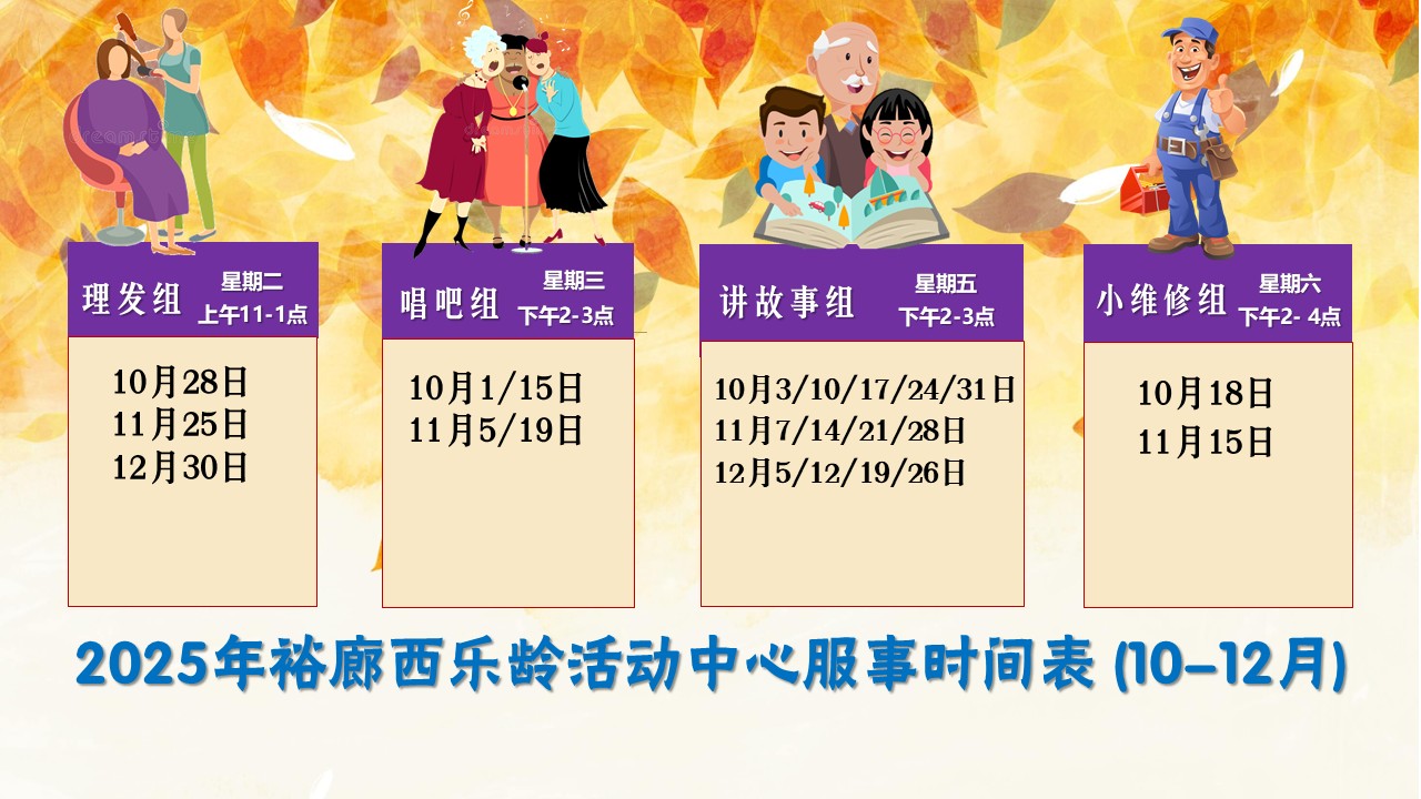 裕廊西乐龄活动中心服事时间表(10-12月)
