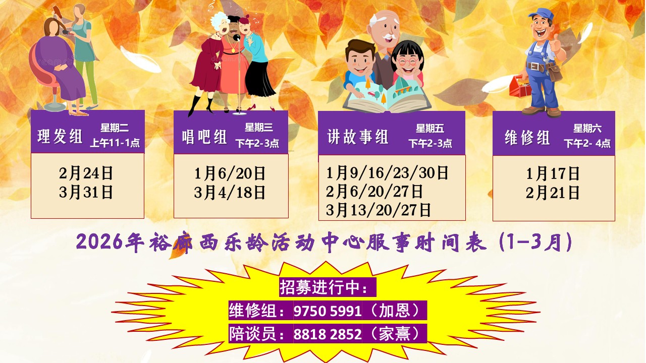 裕廊西乐龄活动中心服事时间表(11-12月)