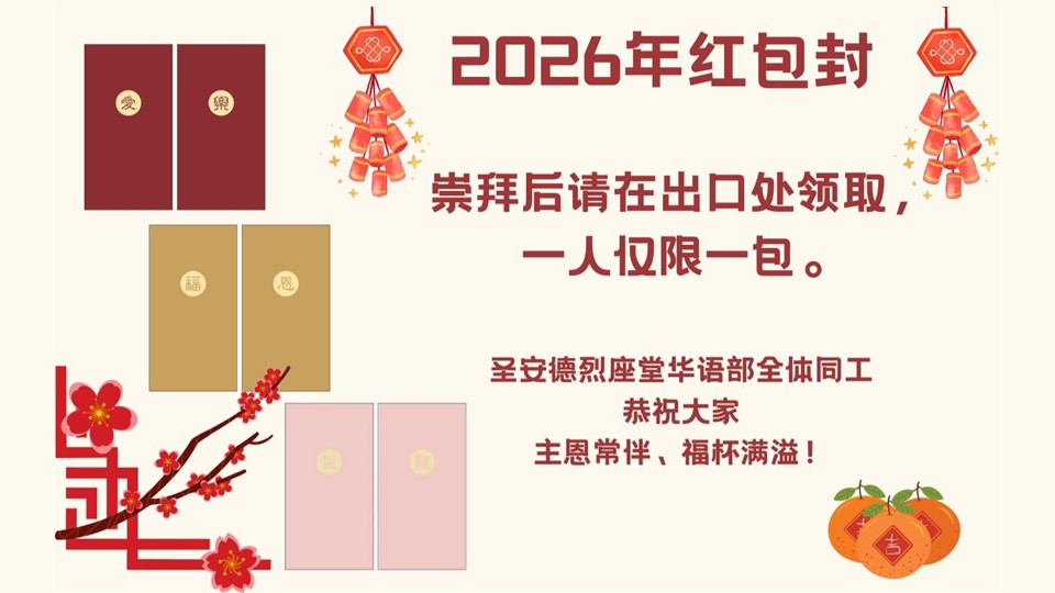 请在崇拜后到服务台索取月捐封,台历,年历本,圣诞卡