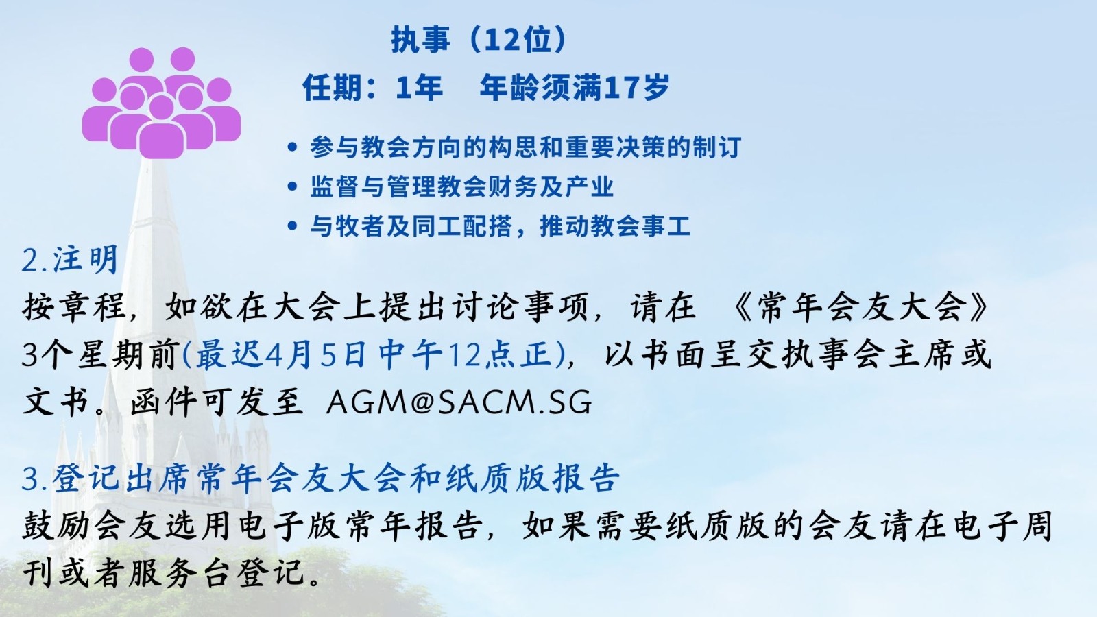常年会友大会当天五堂联合崇拜,鼓励大家出席早堂崇拜,接续参加常年会友大会。