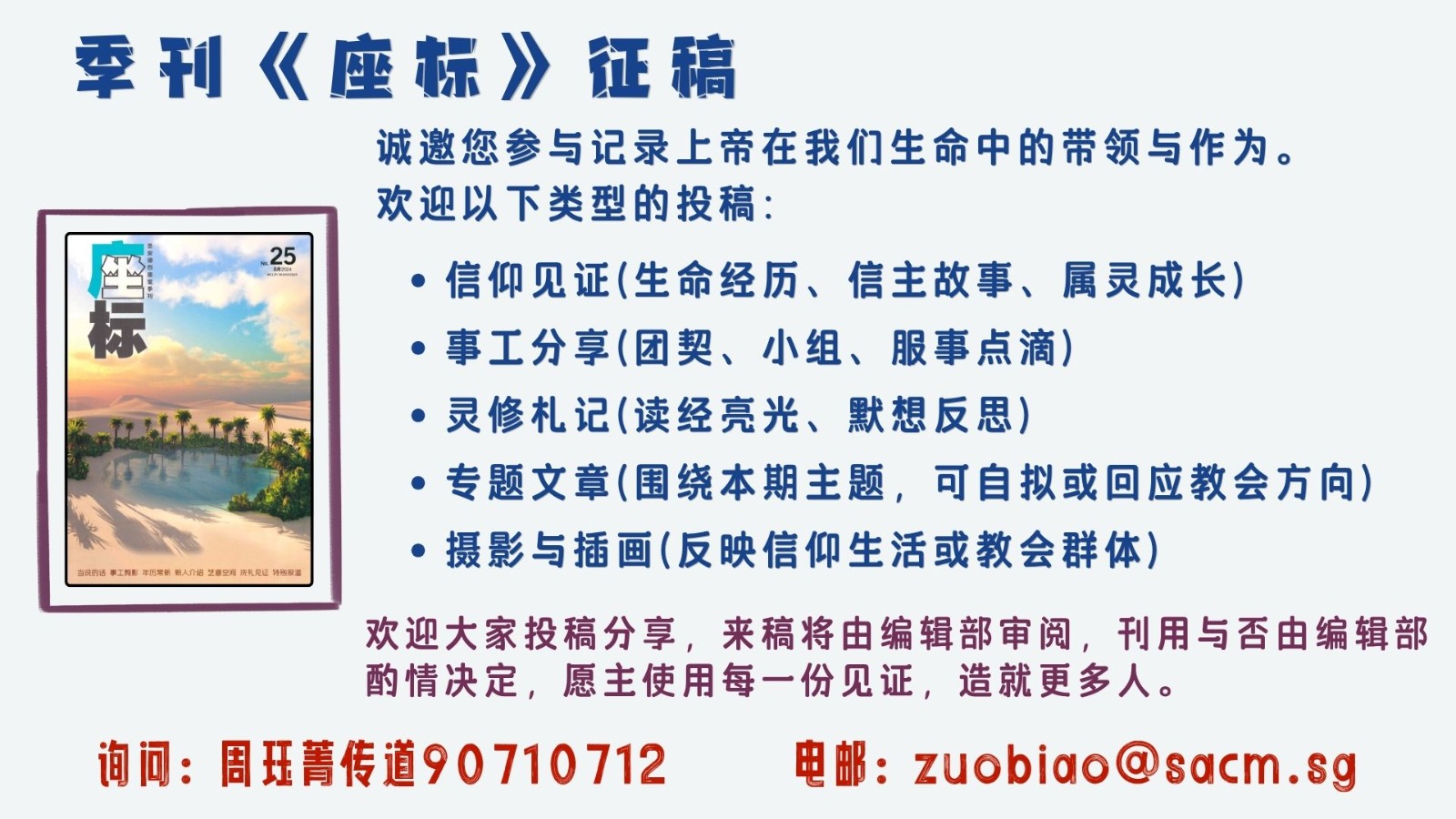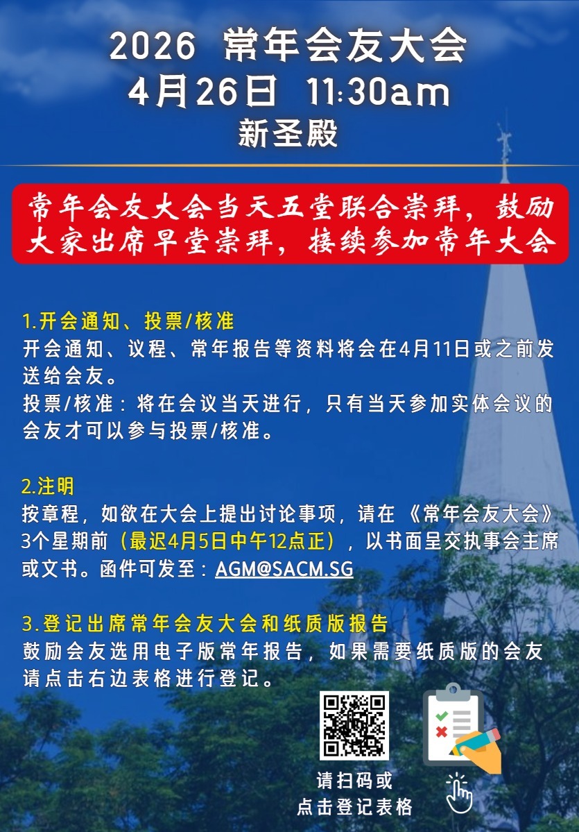 欢迎大家投稿分享。询问请联络周珏菁传道 (90710712, zauobiao@sacm.sg) 。