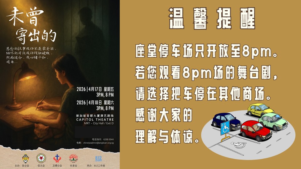 温馨提醒出席舞台剧的观众:座堂停车场只开放至 8pm。